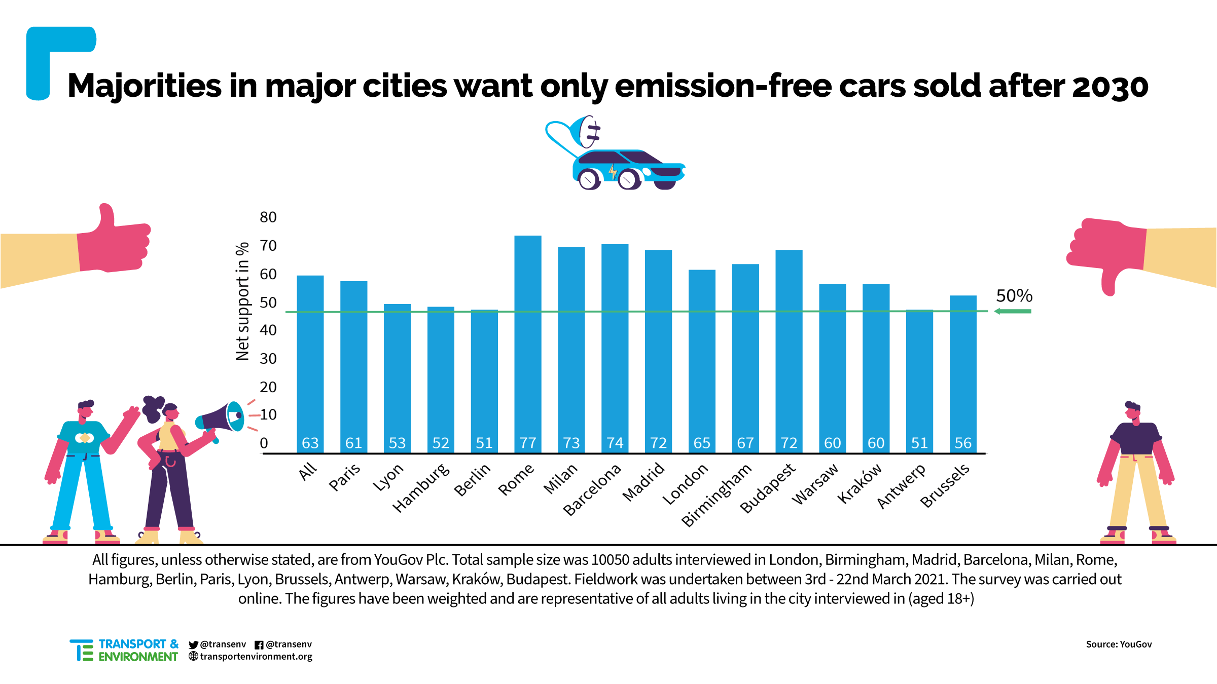 Almost two-thirds of urban residents support banning the sale of new fossil-fuel cars in Europe after 2030, according to aĀ new YouGov online pollĀ in 15 European cities.Ā